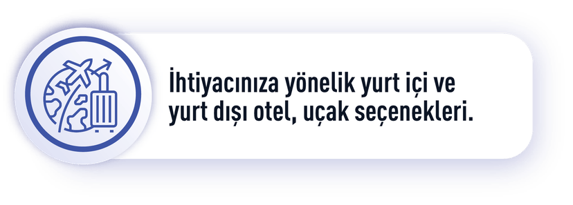 Yurt içi ve yurt dışı iş seyahatlerinizde hizmet bedeli ödemeden geniş otel ağı ve avantajlı fiyatlarla konaklama ihtiyaçlarınıza cevap veriyoruz. Sunmuş olduğumuz ayrıcalıklı hizmetlerimiz ve seyahat platformumuz ile seyahatlerinizi daha pratik ve keyifli hale getirmekteyiz.